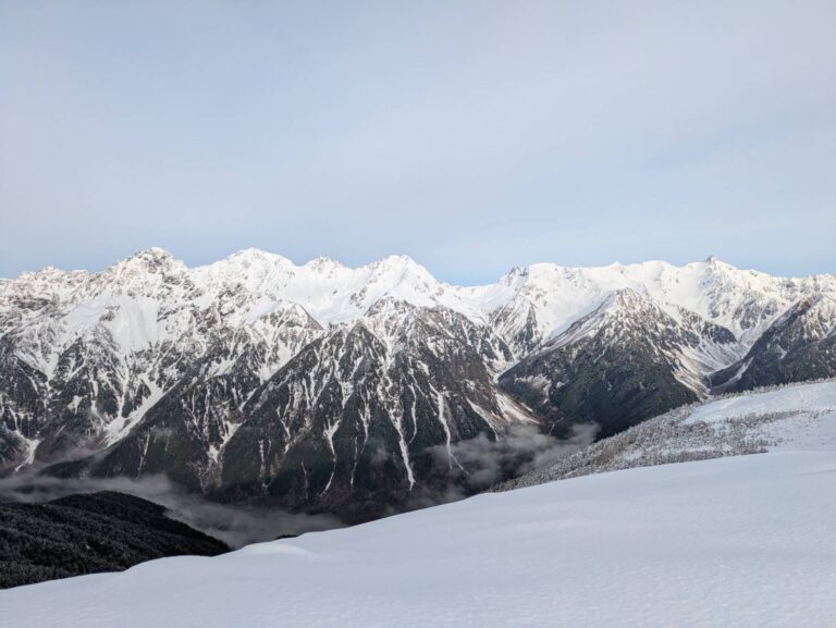 暖かかった日々から一変、昨日とおとといは寒い一日となりました。松本でも日中一桁と冷え込み、山の上では積雪がありました。平場で20センチ、吹き溜まりでは膝くらいの深さです。春にあまり積雪がなく岩稜が目立つ景色ばかりだったので、ようやく白銀に染まった山々を拝むことができました。これぞ小屋開け!の気分です。